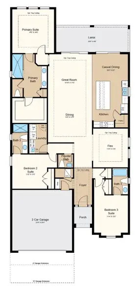 Welcome to the Lazio II at 13644 Fletcher Drive in Esplanade at Coasterra! This new home welcomes you through the front porch and into a flowing foyer that opens to the dining area, spacious great room, and gourmet kitchen. The kitchen features under cabinet lighting, a straight valance wood hood, a center island, and a casual dining nook that makes everyday meals feel effortless. From the main living space, step outside to the covered lanai and enjoy easy indoor-outdoor living. Tucked away for added privacy, the primary suite includes a spa inspired primary bathroom and a walk-in closet with direct access to the laundry room. Toward the front of the home, two secondary bedroom suites with their own bathrooms, a dedicated study, plus a convenient powder room and laundry room complete the layout. Additional Highlights Include: Gourmet kitchen, study in place of flex, extended lanai, 8' interior doors, 10' ceilings, tray ceiling pkg, and door at primary closet to laundry. Photos are for representative purposes only.