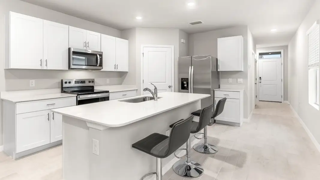 The open concept kitchen is ideal for entertaining and features IMPACT GLASS windows and doors, quartz countertops, a large center island, stainless steel appliances, and light shaker style cabinetry. The spacious primary suite includes dual quartz vanities, a walk in shower, and a private water closet.