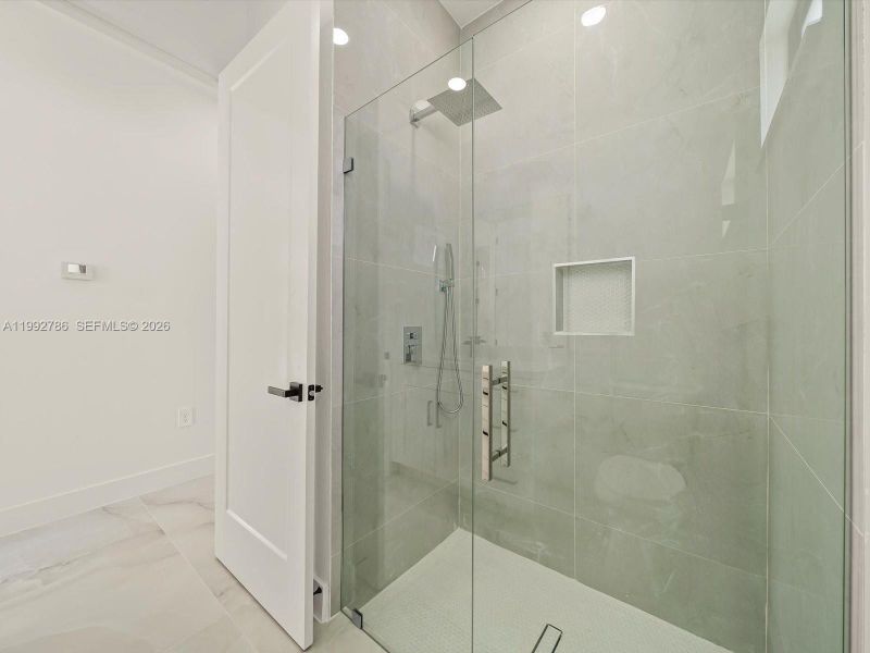 The interior features large-format porcelain tile flooring throughout, a modern kitchen with center island, quartz countertops, and high-quality appliances from top brands. The primary suite includes dual sinks and two walk-in closets, creating a comfortable and functional retreat.