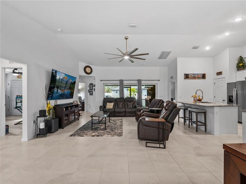 The kitchen is thoughtfully designed with granite countertops, a spacious pantry, and a freestanding island that’s perfect for casual dining or gathering with family and friends. High-end finishes continue throughout the home, including hurricane-impact windows and doors, tile flooring in the main living areas, and a paver driveway that enhances curb appeal.