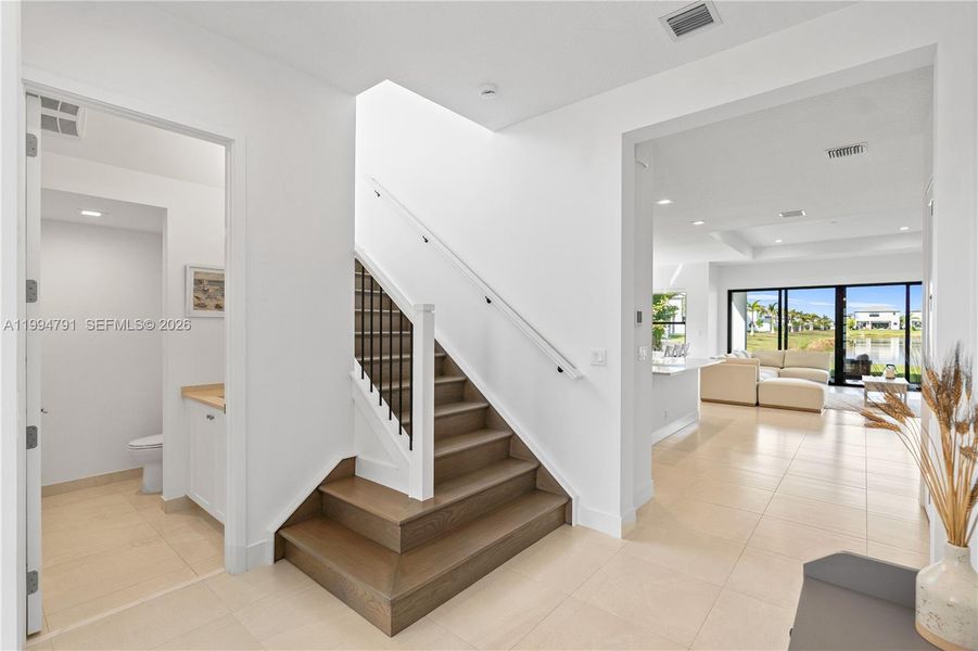 Perfectly positioned on lakefront lot 77 within Boca’s exclusive Lotus Edge, this exceptional Samoa Premium residence offers a prime setting, privacy, and a clean contemporary aesthetic finished in a sophisticated neutral palette that feels elevated yet easy to personalize. Enhanced by a tree-lined easement along the property’s edge and west-facing long-lake views with sunset backdrops, the setting is both serene and visually striking. The kitchen is appointed with an oversized quartz island, light wood-toned cabinetry, stainless steel appliances, double wall ovens, gas cooktop, and generous storage, all opening seamlessly to the great room and dining area with water views. The first-floor primary suite is thoughtfully positioned for privacy and complemented by a spa-inspired bath, while a main-level den/office adds flexibility. Upstairs, 3 bedrooms and 3 baths, together with a spacious loft and covered balcony, create an ideal layout for everyday living and elegant hosting. The garage is equipped with an electric vehicle charger. Per builder floor plan, the home offers approx. 3,249 interior sq. ft. and a large homesite with room for a custom pool. Lotus Edge offers a 39,000-square-foot clubhouse with pools, restaurant/bar, fitness and wellness amenities, racquet facilities, and indoor and outdoor sports. For buyers who want Lotus Edge without the wait for construction, this move-in-ready residence offers immediate enjoyment in one of Boca Raton’s most desirable communities.
