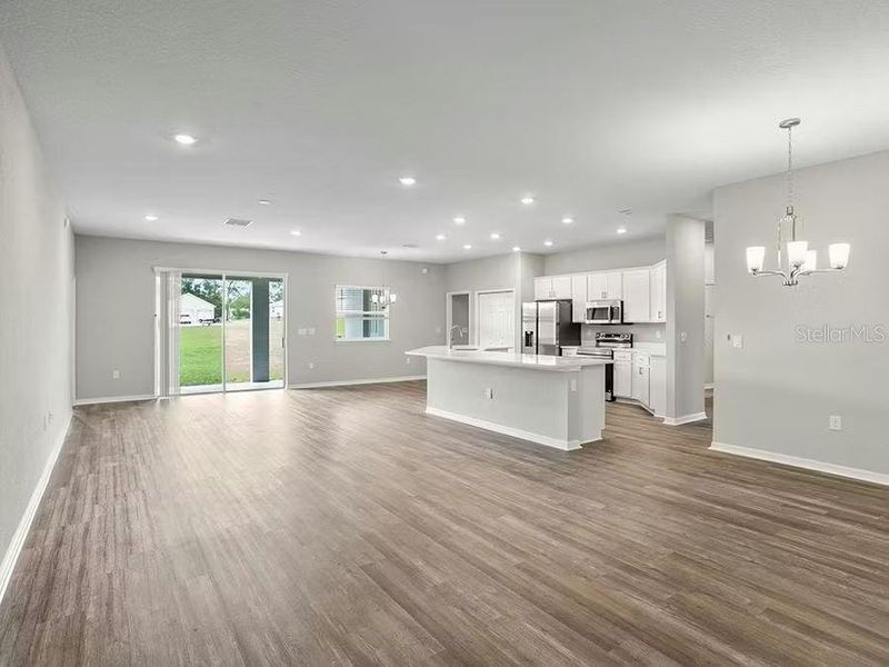 New construction home with 2536 square feet on one-story including 5 bedrooms, 3 baths, and an open living area. Enjoy an open kitchen with Samsung stainless steel appliances, a walk-in pantry, and a spacious breakfast bar, fully open to the dining café and gathering room. The kitchen, living area, laundry room, and baths include luxury wood vinyl plank flooring, with stain-resistant carpet in the bedrooms. Your owner's suite is complete with a walk-in wardrobe and a private en-suite bath with dual vanities, a tiled shower, garden tub and a closeted toilet. Plus, enjoy a covered lanai, 3-car garage. Custom-fit window blinds, architectural shingles, energy-efficient insulation and windows, and a full builder warranty. “Please note, virtual tour/photos showcases the home layout; colors and design options in actual home for sale may differ. Furnishings and décor do not convey.