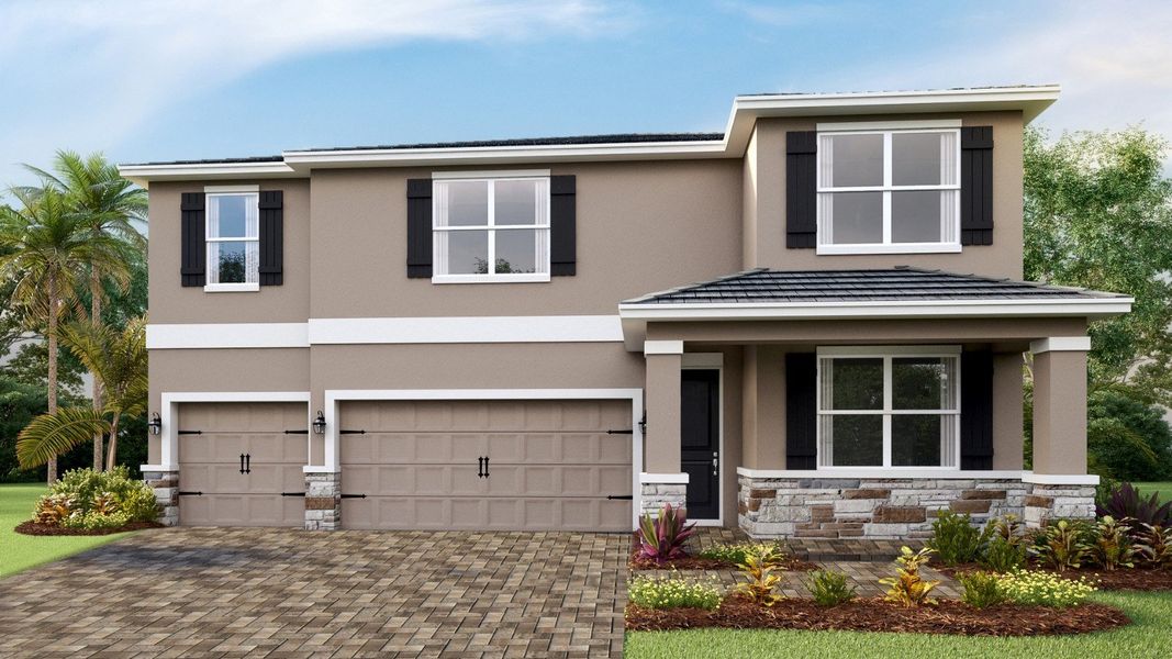 This two-story, concrete block-constructed home features a flex space and a separate dining room upon entry. A well-appointed kitchen with a walk-in pantry and dinette overlooks a spacious great room that leads to a covered lanai. The first floor is complete with a guest suite and a full bath. Bedroom 1 with ensuite bath provides dual walk-in closets and connects to a spacious laundry room for convenience. Three additional bedrooms, one with an ensuite bathroom, can be found off the grand bonus living room.