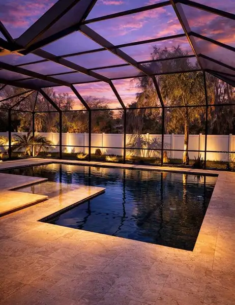 Step outside to your own private resort-style retreat, complete with a custom pool with sun shelf, screened enclosure, and a fully equipped outdoor kitchen with Blaze grill and beverage refrigerator. Two gas fireplaces and dramatic 15-foot vaulted ceilings, including a stunning outdoor feature ceiling, create seamless indoor-outdoor living year-round. The backyard is fully enclosed with a white vinyl privacy fence, offering both security and a clean, finished look.