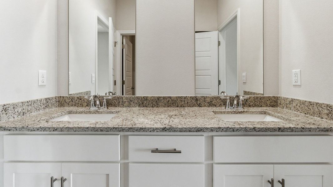In the back of the home, the primary suite is a private retreat. The large bedroom features trey ceilings and natural light, creating an inviting space. The en suite features dual vanities, garden tub, separate walk-in shower and spacious closet.