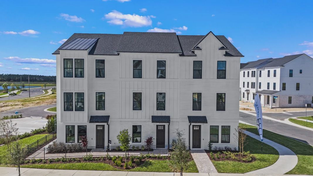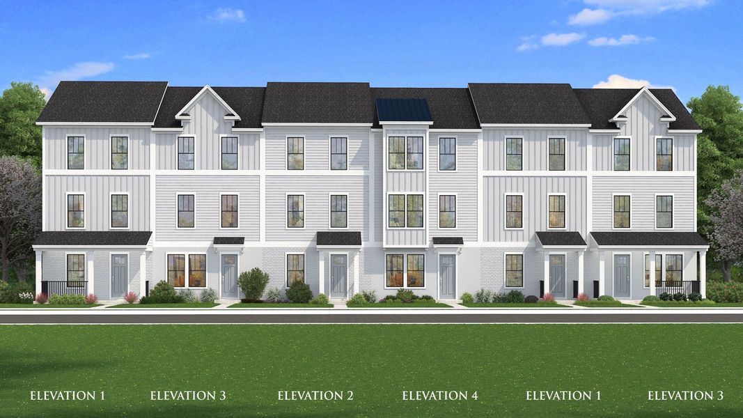 Under Construction. Ready in June! This new construction, three-story townhome (The Lantana) is a showstopper with its popular farmhouse exterior. This townhome features 3 bedrooms, 2 full bathrooms, a powder room, spanning 1,846 sq. ft. As you enter this home through the 8 ft. entry-door, you are welcomed by your spacious flex space. As you continue up, you will find luxury vinyl plank flooring that that leads you to the open concept living room, dining room and stunning kitchen. Your inner gourmet will be delighted by the large eat-in island, 42 in. cabinets with crown molding, quartz counters and soft-close drawers. Your eyes will be drawn to the bank of windows flooding your dining room and kitchen with light. Moving to the third level, you have quick access to the generously sized primary suite that accesses your ensuite bathroom with glass-enclosed shower, dual vanities, and the roomy, well-lit walk-in closet. Adjacent to the primary suite is your laundry room with adjacent, secondary bedrooms and guest bath