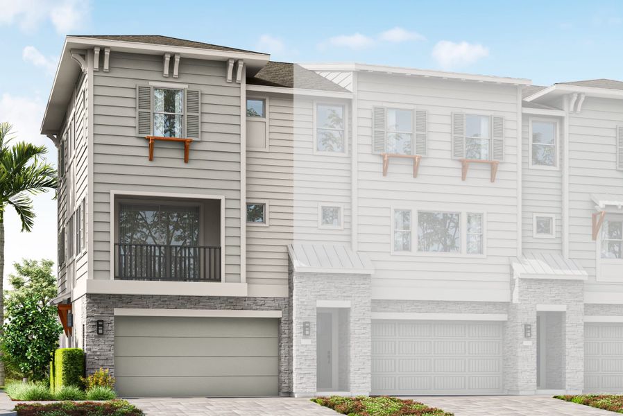 The Driftwood is an end-unit, three-story floorplan designed for comfortable coastal living. It features open gathering spaces and private bedroom layouts. The central kitchen anchors the dining area and great room, creating an open-concept living space that flows directly to an outdoor deck for easy indoor-outdoor living.