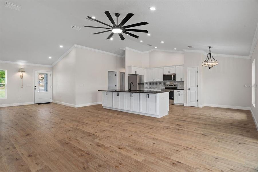 Custom built brand new just completed (4/26) four-bedroom two bath home on almost a half-acre lot (.46) located in the Royal Highlands just off of SR 50. This home features a spacious KITCHEN with granite countertops, soft close wood cabinets, pantry, stainless steel appliances, tiled back splash, crown molding and a 10ft island with an eat at counter; large GREAT ROOM with a cathedral ceiling, crown molding, electric fireplace, built in display niches and a sliding glass door leading out to the lanai; the PRIMARY BEDROOM has a tray ceiling with crown molding and two walk-in closets; PRIMARY BATHROOM has dual sinks, soaking tub, and a walk-in shower with floor to ceiling tile; other features include laminate flooring throughout the house and tile flooring in the bathrooms, five and a half inch baseboards, decorative ceiling fans in all the bedrooms and great room, double pane windows, an inside laundry room with storage cabinets, a sitting area off of the front entrance and a two car garage with garage door opener and attic access. The exterior features Floratam sod in the front and back yard, an irrigation system, covered lanai in the back of the house under truss, front porch, no rear neighbors for added privacy, and plenty of room to park your boat or RV and there are no deed restrictions. Conveniently located within minutes of the Suncoast Parkway, shopping, dining and medical facilities.