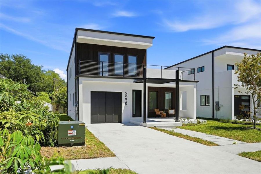 Welcome to this stunning modern new construction home in the highly sought-after North Kenwood, offering 3 bedrooms and 3 full bathrooms with thoughtfully designed, high-end finishes throughout. This all-concrete block residence features luxury vinyl plank flooring, vaulted ceilings that create an open and airy feel, and a designer kitchen complete with quartz countertops, real wood custom cabinetry, stainless steel appliances, and a spacious island with seating—perfect for entertaining. Each bathroom showcases custom tile work for a clean, upscale look, while black-framed hurricane impact windows and doors provide both style and peace of mind. Enjoy Florida living with two private balconies—one off the primary suite and another off the upstairs rear bedroom—ideal for morning coffee or evening relaxation. The home also includes a single-car garage equipped with a 220V EV charger, blending modern convenience with forward-thinking design. Backed by a 1-year labor warranty, 2-year systems warranty, and 10-year structural warranty, this property delivers both quality and confidence in one of St. Petersburg’s most desirable and rapidly growing areas. Preferred lender offering 1.25% credit at closing.