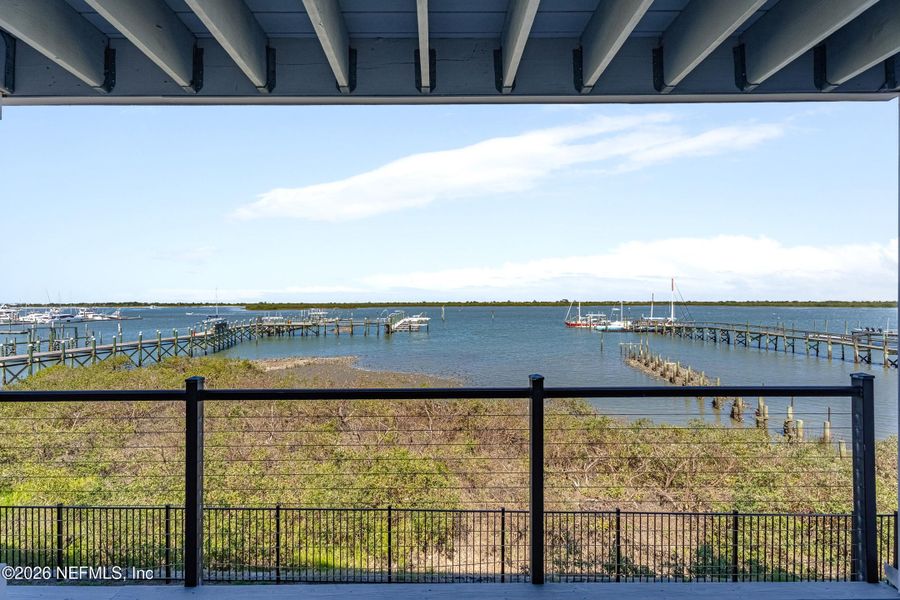 The primary suite offers a quieter retreat, framed by water views and direct balcony access, and complemented by a custom-designed walk-in closet. A series of waterfront-facing balconies extends across each level, from the first through the third, each capturing expansive Intracoastal views, including one just off the kitchen and dining area where the St. Augustine Lighthouse comes into view.