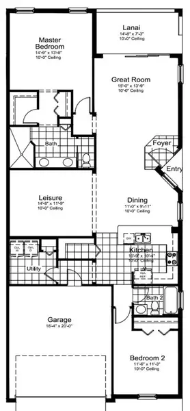 Sliding doors connect the great room to the lanai for when you want to enjoy the outdoors. The master bedroom includes 2 walk-in closets, separate vanity sinks, walk-in shower and a private water closet. This design also includes a leisure room which can be converted into a den for enjoying quality time with guests or creating a private work space.