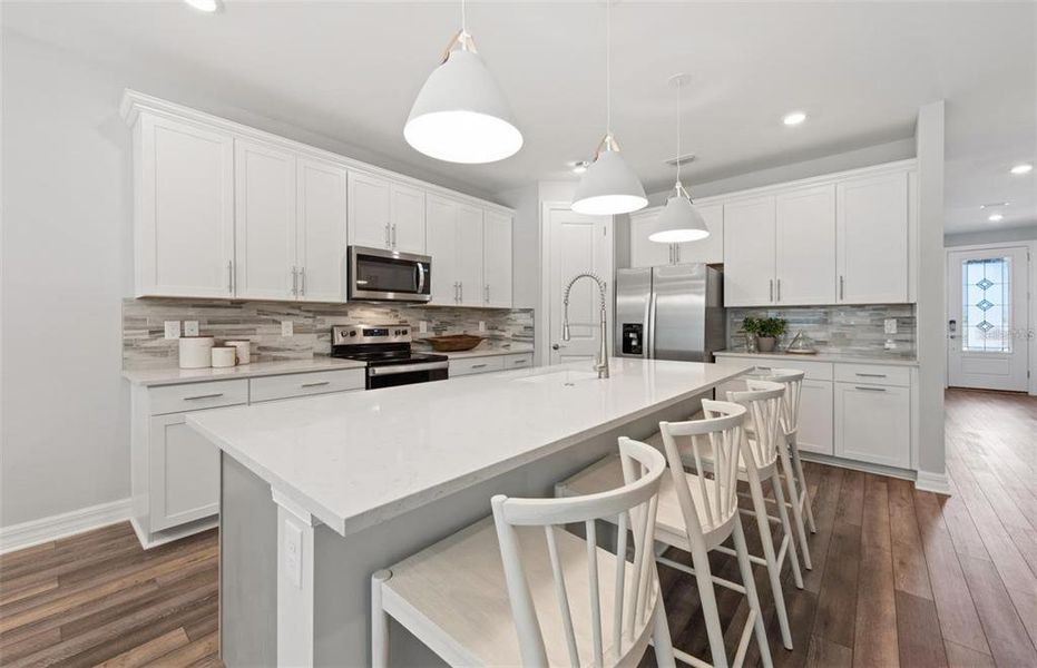 From the moment you enter, you’ll notice the elevated finishes, including 10’ ceilings, 8’ interior doors and luxury vinyl plank flooring throughout the entire first floor, creating a clean, modern feel. The open-concept layout is centered around a designer kitchen featuring white cabinetry, quartz countertops, and KitchenAid appliances, flowing seamlessly into the café and gathering room—ideal for entertaining.
