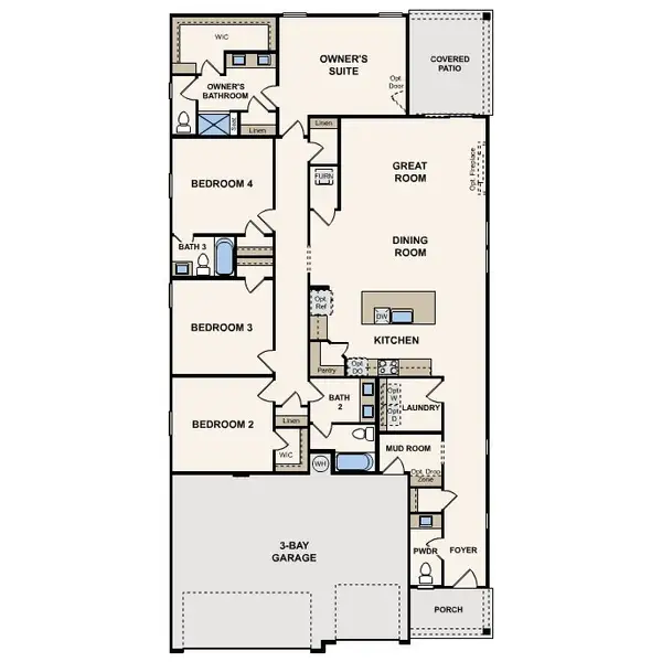 This thoughtfully designed floor plan offers a charming porch entry that leads into a foyer with a powder bath, a mudroom, and a laundry. Next, you’ll find an airy great room overlooking an open layout with a dining area and an impressive kitchen with an island and a walk-in pantry. Four secondary bedrooms are on the left of the foyer with two shared baths. The serene primary suite is secluded at the back of the residence, showcasing a large walk-in closet and a private bath with dual vanities and a walk-in shower. Also includes a covered patio and a 3-bay garage!