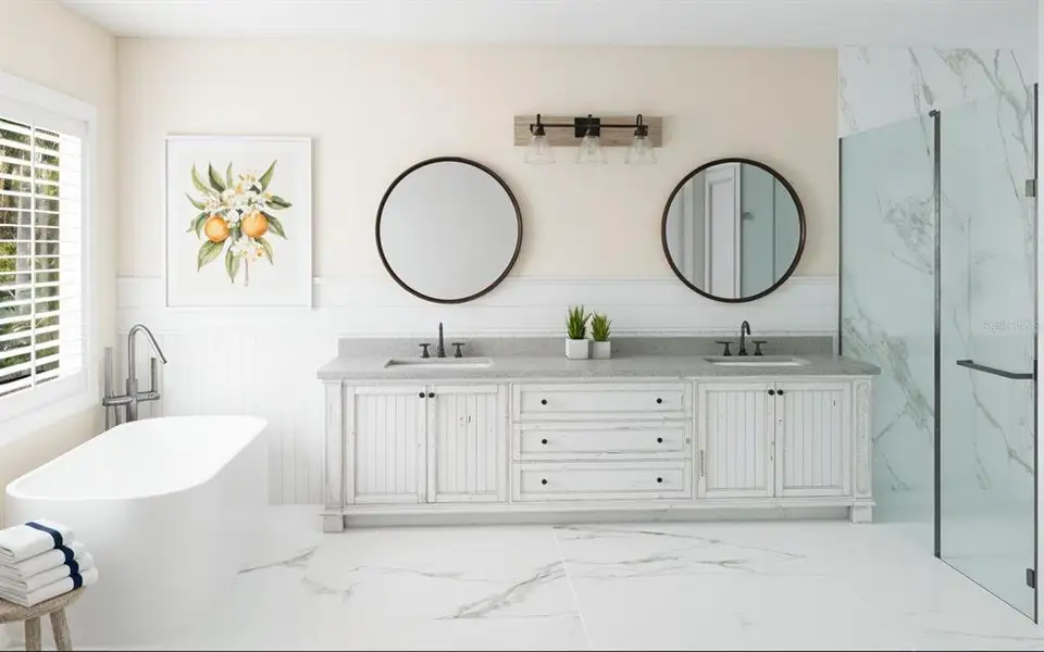 Upstairs, you'll find four spacious bedrooms. The expansive master suite serves as a true retreat, featuring separate "His" and "Hers" walk-in closets and a spa-like ensuite. The master bath is a study in coastal luxury, boasting Belucci Bianca polished porcelain floors, Romanta Crema shower walls, and La Belle Purity hexagon ceramic mosaics.