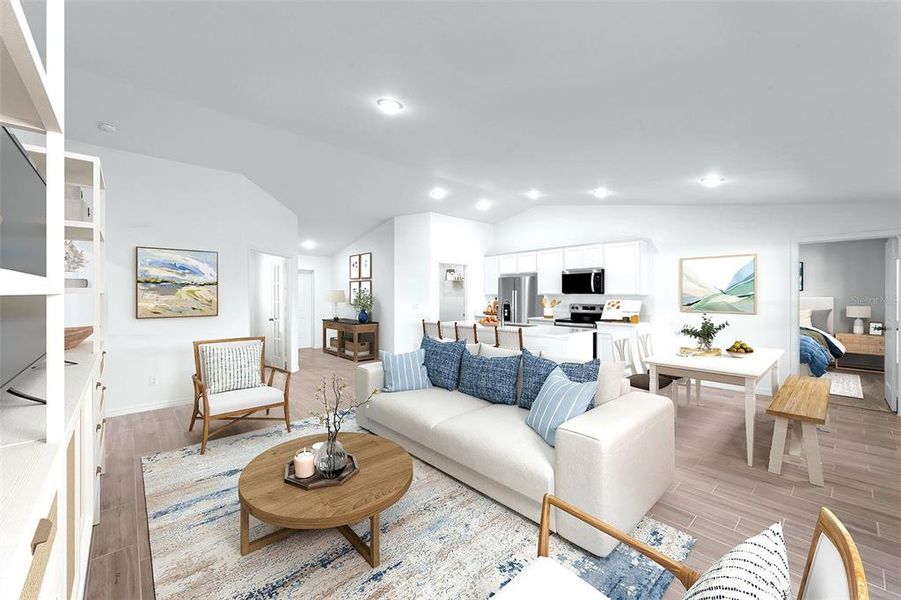 NEW CONSTRUCTION WITH WARRANTY! Estiimated delivery August 2026. The Cayo Costa combines open-concept living with a smart split-bedroom layout, offering three bedrooms plus a den and two bathrooms. Perfectly designed for entertaining, the main living area showcases a soaring vaulted ceiling that seamlessly connects the kitchen, dining area, and expansive Great Room. A large freestanding island provides the ideal centerpiece for both casual meals and social gatherings, while sliding glass doors extend the living space to a covered lanai for effortless indoor-outdoor living. The private Primary Suite is a true retreat, featuring two spacious walk-in closets and a well-appointed en-suite bathroom. On the opposite side of the home, two comfortable guest bedrooms share a full bath, ensuring both privacy and convenience. A versatile den with French doors offers the perfect space for a home office, study, or creative flex room. Highlights of the Cayo Costa include: Quartz countertops in kitchen and baths, designer cabinetry with soft-close doors, stainless steel kitchen appliance package, upgraded plank tile flooring in main living areas, hurricane-impact windows and doors, attached 2-car garage with direct laundry access, and more! Pictures, renderings, & virtual tour are of similar home & are used for display purposes only.