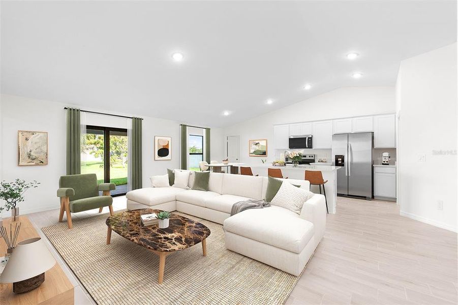 NEW CONSTRUCTION WITH WARRANTY! *Estimated delivery August 2026." The Cayo Costa combines open-concept living with a smart split-bedroom layout, offering three bedrooms plus a den and two bathrooms. Perfectly designed for entertaining, the main living area showcases a soaring vaulted ceiling that seamlessly connects the kitchen, dining area, and expansive Great Room. A large freestanding island provides the ideal centerpiece for both casual meals and social gatherings, while sliding glass doors extend the living space to a covered lanai for effortless indoor-outdoor living. The private Primary Suite is a true retreat, featuring two spacious walk-in closets and a well-appointed en-suite bathroom. On the opposite side of the home, two comfortable guest bedrooms share a full bath, ensuring both privacy and convenience. A versatile den with French doors offers the perfect space for a home office, study, or creative flex room. Highlights of the Cayo Costa include: Quartz countertops in kitchen and baths, designer cabinetry with soft-close doors, stainless steel kitchen appliance package, upgraded plank tile flooring in main living areas, hurricane-impact windows and doors, attached 2-car garage with direct laundry access, and more! Pictures, renderings, & virtual tour are of similar home & are used for display purposes only.