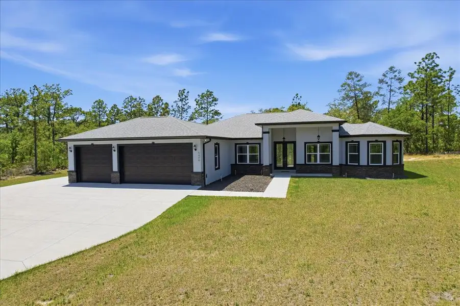 NO NEED TO WAIT ON CONSTRUCTION! THIS NEVER LIVED IN 2025 HOME IN PINE RIDGE HAS SPACE TO SPREAD OUT, MODERN STYLE, AND TRULY STANDS APART! Step into this stunning 2025 custom-built 3 bedroom (plus office), 3 bath, 3 car garage home in Pine Ridge where every detail feels intentional from the moment you arrive. The stacked stone pillars and grand double door entry welcome you into a bright, open floor plan with soaring tray ceilings and beautiful luxury vinyl plank flooring throughout. The living room is spacious and inviting, complete with a custom built-ins for your entertainment center, and flows seamlessly into a show-stopping kitchen featuring white cabinetry, a massive curved island with dark countertops, double built-in ovens, a gas cooktop with a sleek stainless range hood, modern statement lighting, and huge pantry. Natural light fills the home, including a beautiful dining nook surrounded by windows overlooking your private, tree-lined lot. This 3 bedroom (plus office), 3 bathroom split floor plan offers a true retreat in the oversized primary suite with tray ceilings, dual walk-in closets, and a spa-like bathroom featuring double vanities and an elongated walk-in shower with upscale finishes. Even the laundry room is thoughtfully designed with built-in cabinetry, workspace, and a utility sink. A dedicated pool bath is already in place, making it easy to create your future backyard oasis, while the oversized 3-car garage, extended driveway, and expanded concrete pad add both convenience and durability. High and dry, no flood insurance required. Located in the highly sought-after Pine Ridge community of Citrus County, residents enjoy 28 miles of equestrian trails, stables, riding areas, tennis courts, and a community center. Zoned for Central Ridge Elementary School, Citrus Springs Middle School, and Lecanto High School. Conveniently located with easy access to both Citrus and Marion Counties and the Suncoast Toll Road ramp is just outside the entrance to Pine Ridge, so you can be to the Tampa Airport in just over an hour! This property offers the perfect balance of privacy, recreation, and accessibility, all within Florida’s beautiful Nature Coast. Don't let this one get by!