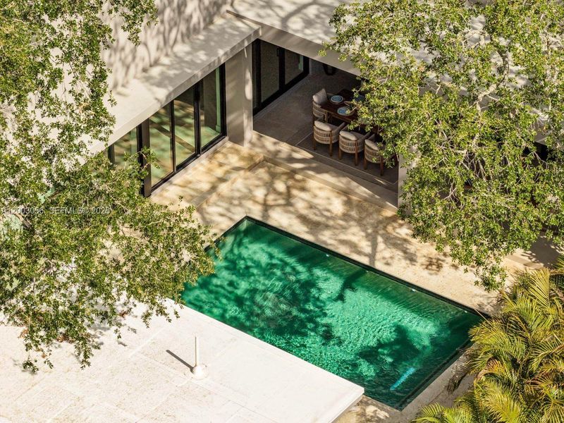 Outdoors, a private Tulum-inspired retreat awaits with a sleek pool, lush landscaping, full summer kitchen, and full cabana bath. A sculptural spiral staircase leads to a second-floor terrace, adding a striking architectural element. Spacious bedroom suites provide comfort and privacy throughout. Ideally located just minutes from the Design District, beaches, and Miami’s top dining, this residence offers refined modern living in a prime setting.