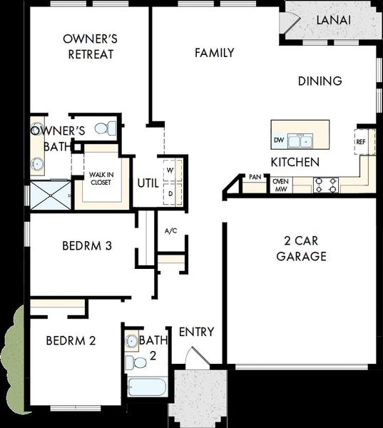 The Rosbach bungalow offers stylish, easy single-story living with a designer kitchen at the heart of the home and an open flow to the dining and family rooms. Natural-tone cabinetry, laminate flooring, and warm gold plumbing fixtures and cabinet hardware create a clean, inviting look. With 3 bedrooms and 2 bathrooms, the layout balances a private Owner’s Retreat with flexible secondary bedrooms for guests, work, or hobbies—plus the everyday convenience of an attached 2-car garage.