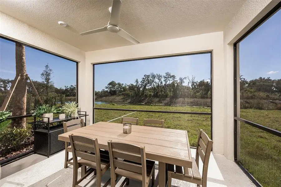 As you enter through the foyer, you’re welcomed into a large, open main floor where the kitchen, dining area, and great room seamlessly connect. The kitchen is a dream for any home chef, spanning two full walls and offering abundant cabinets, generous counterspace, and a walk-in pantry for all your storage needs. A central hub for entertaining, the kitchen also opens directly to the dining area, which comfortably seats six, and the spacious great room—ideal for that oversized sectional and large-screen TV. Just off the kitchen, glass sliders lead to a covered lanai, perfect for enjoying Florida’s outdoor living year-round.