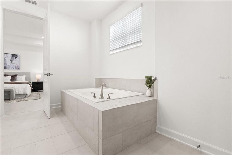 The heart of the home unfolds into a spacious open-concept layout featuring a beautifully appointed kitchen, casual dining nook, and expansive Great Room that flows seamlessly to a covered balcony, ideal for enjoying Florida’s year-round weather. The first-floor owner’s suite is a true retreat, complete with a spa-style bathroom offering dual vanities, a soaking tub, separate shower, and an oversized walk-in closet.