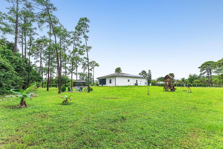 Prepare to be impressed. This 2023 ultra modern show stopper blends luxury, security and a convenient location and is perfectly positioned on a professionally landscaped corner lot. Step inside to discover this highly sought after open, light-filled floor plan where 12 ft ceilings and elegant flooring create an immediate sense of contemporary grandeur. The heart of the home is a chef's dream, featuring top-of-the-line stainless steel appliances, separate oven, exquisite quartz countertops and additional custom designed cabinetry accented with sophisticated LED lighting. Entertain effortlessly in the huge great room anchored by a stylish decorative fireplace effortlessly in the huge great room, anchored by a stylish decorative fireplace that adds that extra touch of opulence. Your private retreat awaits in the master suite boasting dual sinks, freestanding Roman tub, separate shower and a huge walk-in closet designed to amaze. The home is engineered with hurricane impact windows for security and noise reduction, solar panels for energy efficiency and it meets all of Florida's latest building codes. Unique to this model, the second bedroom is also an ensuite. Outside your personal paradise awaits. Enjoy endless evenings in the screened Gazebo, gather around the Fire Pit and relish the unparalleled space and privacy. The expansive and thoughtfully designed landscaping is replete with cypress trees lining the driveway, palm trees and mini gardenias for year round curb appeal. Strategically placed shrubbery, multiple fruit trees and additional plants adorn the back yard. The oversized yard is perfect for play and pets while the gazebo is perfect for al fresco dining. This is outdoor living at its best. Embrace the convenience of a location close to Northlake Blvd with essential amenities, including shopping, eateries and medical facilities (see photos) nearby. There is NO HOA. And there is also public water, which is a rare find in this area. This move-in-ready home is waiting to be experienced...schedule your tour today. Financing incentives are available on all properties from SIRVA Mortgage, Inc.