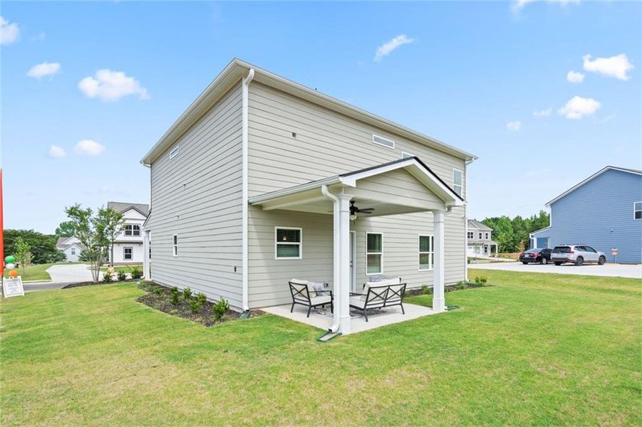 Enjoy outdoor relaxation on the covered rear porch, perfect for morning coffee or evening gatherings.