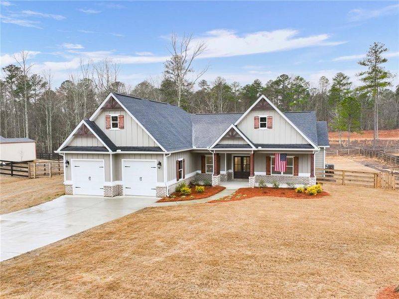 Welcome home to this nearly new, beautifully crafted 4-bedroom, 3-bath farmhouse-style ranch, perfectly situated on 3.5 peaceful acres. Built just one year ago, this thoughtfully designed home blends timeless style with modern comfort — all with no HOA restrictions.