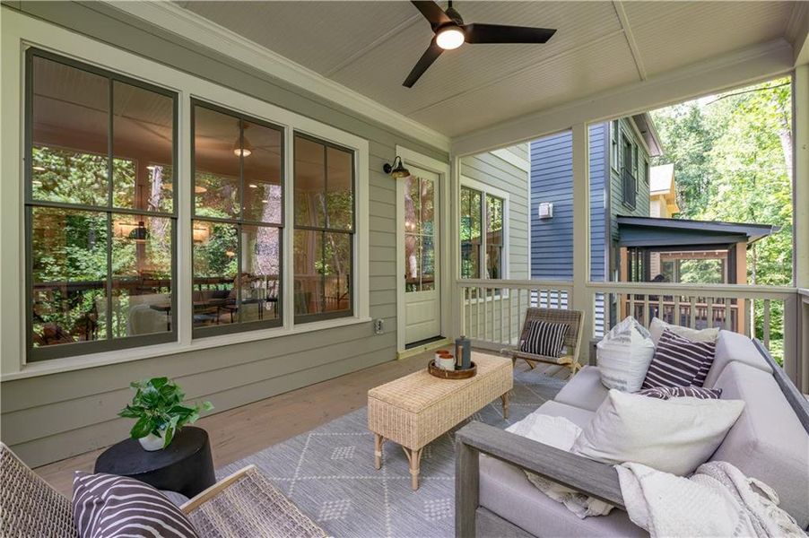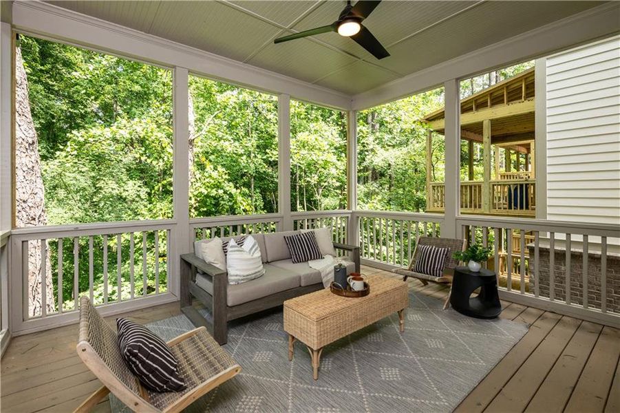 Two inviting outdoor living areas bring the forest even closer: a spacious screened deck off the main-level family room, ideal for evening wine or morning coffee, and a second outdoor lounge below, offering another serene spot to connect with nature.