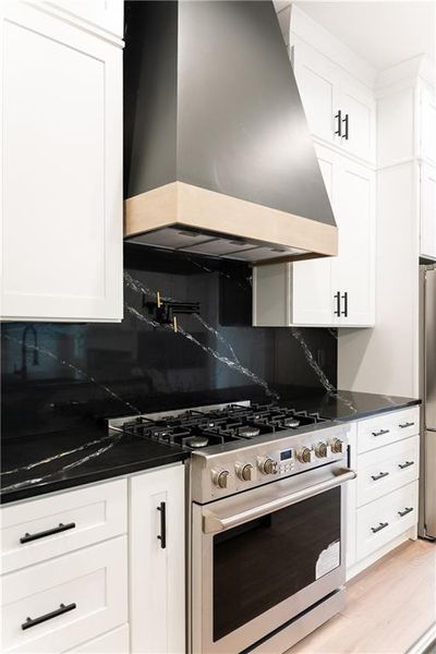 The gourmet kitchen serves as the centerpiece of the home and showcases a striking waterfall island countertop, designer finishes, ample cabinetry, and seamless flow into the dining and living areas, making it ideal for entertaining and daily enjoyment.
