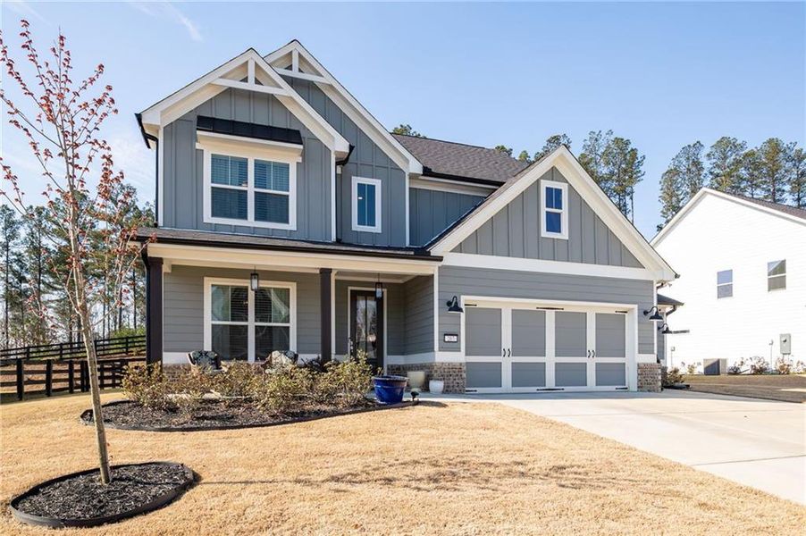 Welcome to this move-in-ready Craftsman-style home located in the highly sought-after Nature Walk at Seven Hills community. Built less than two years ago, this residence showcases numerous high-end upgrades throughout and offers approximately 2,931 square feet of thoughtfully designed living space, including four bedrooms, three full bathrooms, one half bath, and a three-car garage. The main level features an open-concept layout with luxury vinyl flooring throughout. Highlights include an office/flex room, a formal dining room with coffered ceilings and elegant wainscoting, and a spacious family room centered around a beautiful brick fireplace. Large windows provide abundant natural light throughout the home. The chef’s kitchen features white cabinetry, quartz countertops, a large center island, stainless steel appliances, a cooktop with vent hood, a walk-in pantry, a butler’s pantry, mudroom. The seller has invested in extensive upgrades, including enhanced lighting fixtures throughout, added wainscoting in the entryway, multiple bedrooms, and bathrooms, as well as an upgraded vanity in the half bath. All bedrooms are located on the second level. The oversized primary suite features a spacious walk-in closet and a luxurious en-suite bathroom complete with double vanities, a frameless glass shower, and a soaking tub. Three additional bedrooms, two full bathrooms, and a conveniently located laundry room complete the upper level. A versatile loft area provides additional space for a playroom, media room, or sitting area. The exterior offers professionally landscaped grounds with an irrigation system, a fully fenced backyard with three access gates, and a covered rear patio. The extended driveway provides additional parking alongside the three-car garage. Residents of Nature Walk at Seven Hills enjoy resort-style amenities, including a water park with slides and splash features, an Olympic-size pool, tennis and pickleball courts, playgrounds, walking trails, a clubhouse, and a variety of year-round community events.