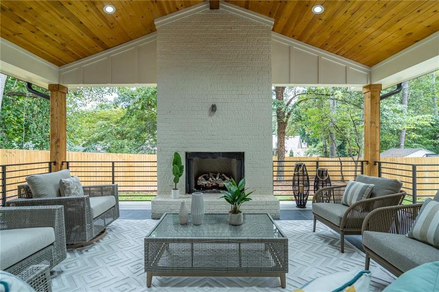 - SkylightGas Log FireplaceOutdoor FireplaceBackyardSoaking TubLandscapingCabinetsPatioFireplaceYardPorch