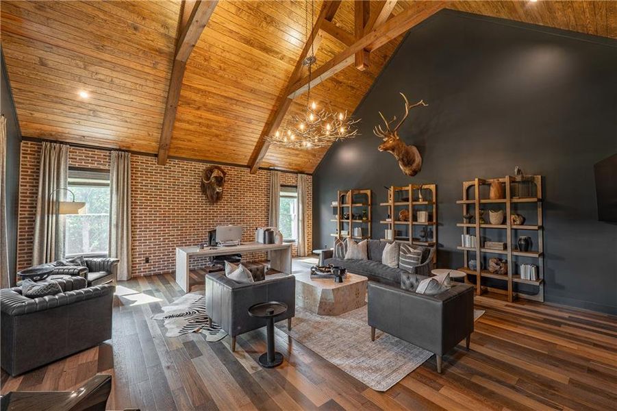 Inside, soaring ceilings, expansive windows, and warm textures set the stage for a thoughtfully designed floor plan with four bedrooms, three full baths, and two half baths. The gourmet kitchen is the heart of the home, featuring striking White Patagonia quartzite countertops and backsplash, Wolf appliances, a Sub-Zero refrigerator, and custom cabinetry. The primary suite is a true retreat with vaulted ceilings, exposed beams, stone fireplace and a brick accent wall, while the spa-inspired bath indulges with herringbone-honed marble flooring, an oversized dual shower, and level four quartz countertops.