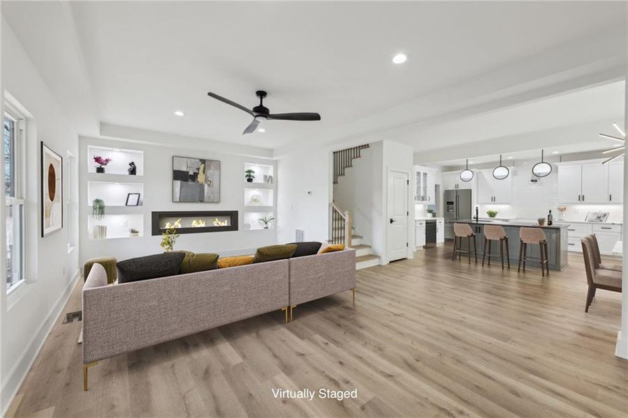 This Charleston-style new construction home blends modern luxury with thoughtful details at every turn. The open floor plan creates an inviting atmosphere, anchored by a spacious kitchen with a grand island, dual sinks, a sleek range hood, and a generous banquette area for stylish dining. Custom built-ins frame the electric fireplace in the living room, adding warmth and sophistication. Stunning fixtures are thoughtfully placed throughout, elevating every space.