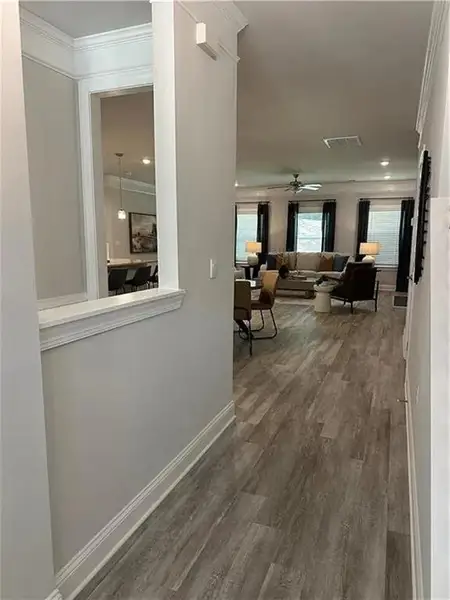 Welcome to the 3210 floor plan by Adams Homes in Mirror Lake at South Harbour offering approximately 3,210 square feet, 5 bedrooms, and 3.5 bathrooms in a versatile 1.5-story design. The open kitchen features white cabinetry, upgraded Gallery stainless steel appliances, a large center island, and walk-in pantry flowing seamlessly into the dining area and spacious family room; ideal for gatherings and everyday living. The main-level primary suite offers privacy and convenience, while upstairs includes an additional bedroom, full bath, and flexible recreation space suitable for a home office, media room, fitness area, or guest accommodations. Enjoy the covered lanai overlooking upgraded landscaping, creating a comfortable outdoor retreat. This home is move-in ready with blinds, refrigerator, washer, dryer, irrigation system, and security system included. Mirror Lake amenities include two golf courses, tennis courts, swimming pools, pickleball courts, and walking trails. Conveniently located in Villa Rica near The MILL Amphitheater, Clinton Nature Preserve, and historic downtown Villa Rica.