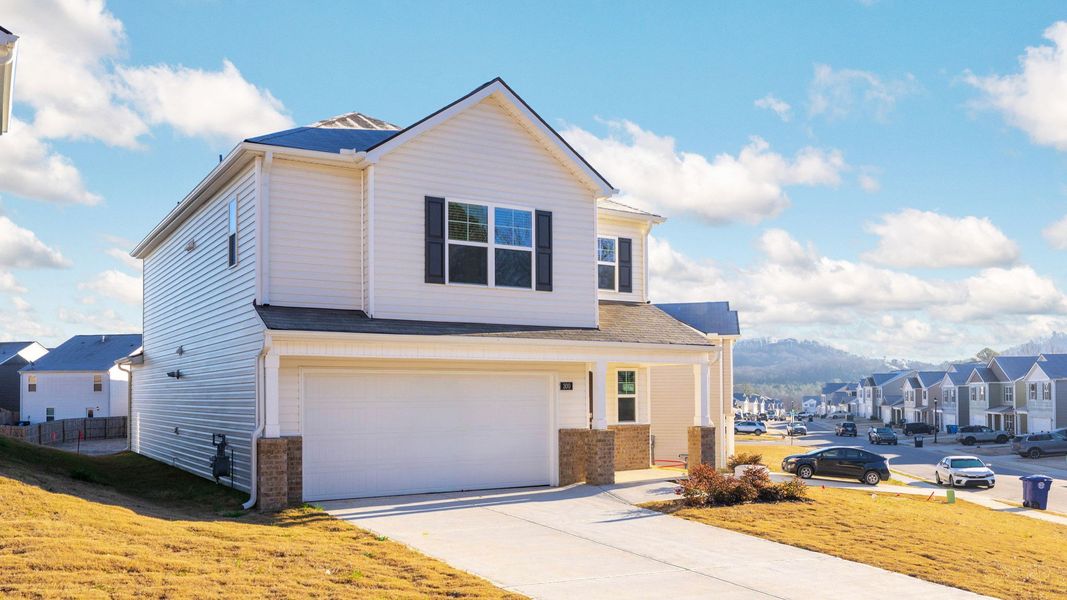 The Darwin floor plan is available at 300 Draft Street located in our Hawk's Ridge in Rossville, GA. It's a charming two-story home that offers an open-concept main level with a spacious kitchen, pantry, and island with countertop seating. The kitchen overlooks an expansive living area, a well-lit breakfast nook, and an outdoor patio. The foyer has a powder room for convenience. Moving to the upper level, you'll find a desirable primary bedroom with a walk-in closet and private bathroom. There are also two additional bedrooms, each with a walk-in closet. An additional bathroom and laundry room complete the upstairs of this beautiful home. *