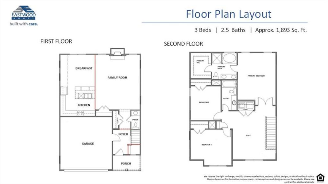 The Ellerbe is a two-story, three-bedroom, two-and-a-half-bath home with a spacious, open family room, kitchen, island, pantry, and a separate breakfast area. The second floor features all three bedrooms, including the primary bedroom, a laundry room, a hall bathroom, and a loft area. Options available to personalize this home include a covered rear porch, screen porch, or sunroom, several fireplace options, a fourth bedroom instead of the loft area, and an optional third floor with a bonus room or bedroom and full bath.