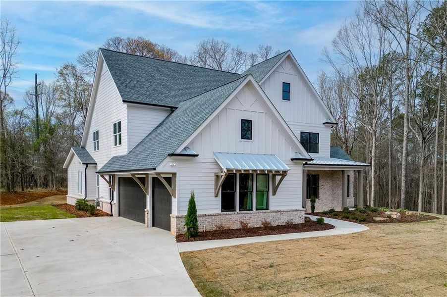 New custom-built farmhouse in a new community with large estate-sized lots ranging from 1.5 to over 4 acres in west Jackson County! This open concept master-on-the-main floorplan has a spacious open vaulted kitchen w/large work island, plenty of painted cabinetry, Quartz countertops, an island waterfall, large walk-in pantry with wood shelving, double ovens, and gas cooktop that flows into the family room with fireplace, sliding paneled glass door, and vaulted ceilings. Separate dining/breakfast area. Split-bedroom plan with a large master suite on main. Master bath with separate his and her vanities, HUGE tiled shower with dual showerheads, free-standing tub, plus an oversized walk-in closet with built-in shelving. Additional guest suite and private full bath on main level. Laundry room on main with cabinets above the washer/dryer and separate cabinet base sink. The split stairway with hardwood treads leads upstairs to three spacious secondary bedrooms featuring one private bath and another J-n-J bath with dual vanities, plus a separate loft or media room. Mud room off the 3-car side-entry garage. Vaulted covered rear porch with fireplace views the wooded private 3.26-acre lot. 10' ceilings on the main with 8' tall doors, wide stairway with hardwood treads, hardwood floors on the main level except bedrooms and wet areas, full front porch...don't miss this one!