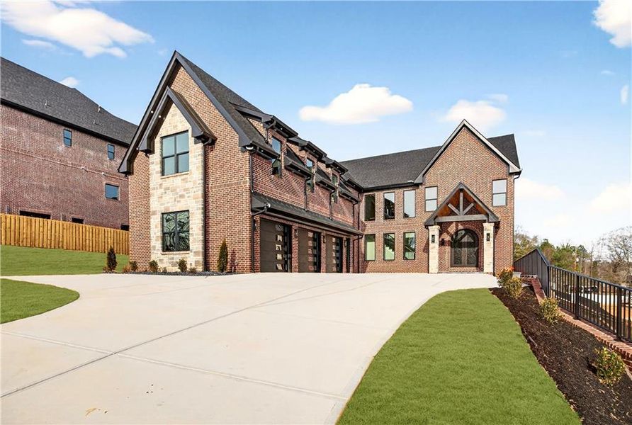 commanding façade adorned with brick, stone, and architectural metal roof accents. The grounds are equally impressive, with a large,