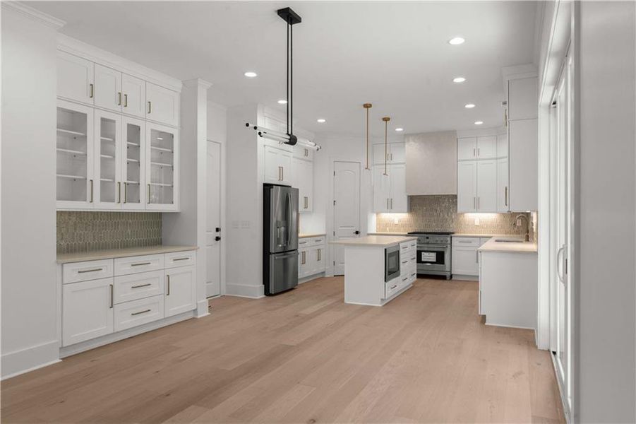 A dramatic two-story great room sets the tone with soaring ceilings and a striking statement fireplace, flowing effortlessly into a designer chef’s kitchen equipped with a gas cooktop, wall oven, built-in microwave, custom vented hood, quartz countertops, an oversized waterfall island, and a walk-in pantry perfect for both entertaining and daily living.
