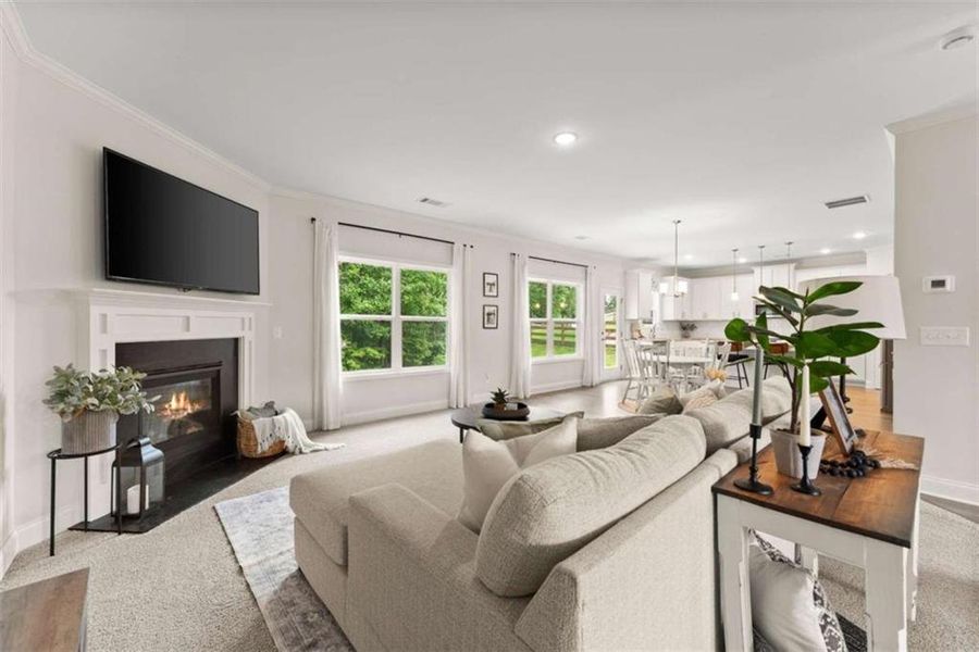 The heart of the home is the gourmet kitchen, complete with stainless steel appliances, center island, and abundant cabinetry, flowing seamlessly into the oversized living room—perfect for entertaining or everyday family life. Expansive windows fill the home with natural light, creating a bright and inviting atmosphere.