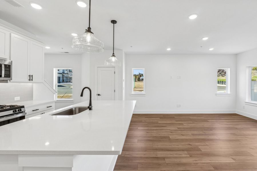 **END UNIT** This end unit features windows in the entry way, family room, and upstairs guest bedroom. The oversized Owner's Retreat is located at the back of the home, offering unique, nature-filled views and enhanced privacy. Two additional bedrooms provide space for a young family, home office, or exercise room. A conveniently placed utility room on the second floor adds great functionality. The home includes a 2-car garage, guest parking close by, and lawn care for low-maintenance living. Community amenities include a swimming pool, open-air cabana, and a mail kiosk. Design selections were chosen from our Classic Collection by our award winning design team. Features include White cabinets, matte black finishes, and kitchen island pendants.
