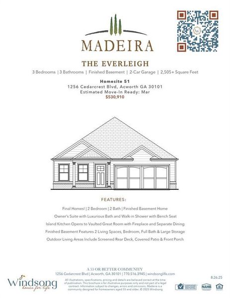 ONE OF THE FINAL MADEIRA HOMES - THIS HOME IS IN PROCESS - TO BE BUILT and READY IN MARCH!! The EVERLEIGH ranch floorplan has everything you want and need, from the welcoming front porch and foyer, through the well thought out kitchen with lots of natural light and opening to the vaulted Great Room and dining area. Continue into the large, naturally lighted Owner's Suite and Owner's Bath that includes walk in shower with bench seat. The private screened rear deck and covered patio off the Great room allow private outdoor enjoyment. On the terrace level you will find a 3rd bedroom with a full bathroom as well as two large living spaces and a separate office. Also, great unfinished space for storage! Just SOME of the Standard Features are - Step free access and wide doorways, levered door handles, casing trim, 5" base moulding, pendant lights, garbage disposal, ceiling fans, LVP flooring, painted and trimmed garage, insulated garage door w/openers. HOA maintains landscape plus irrigation! Experience how inspired design, thoughtful architecture, enriching amenities and vibrant people in our 55+ Active Adult communities can enhance your lifestyle.