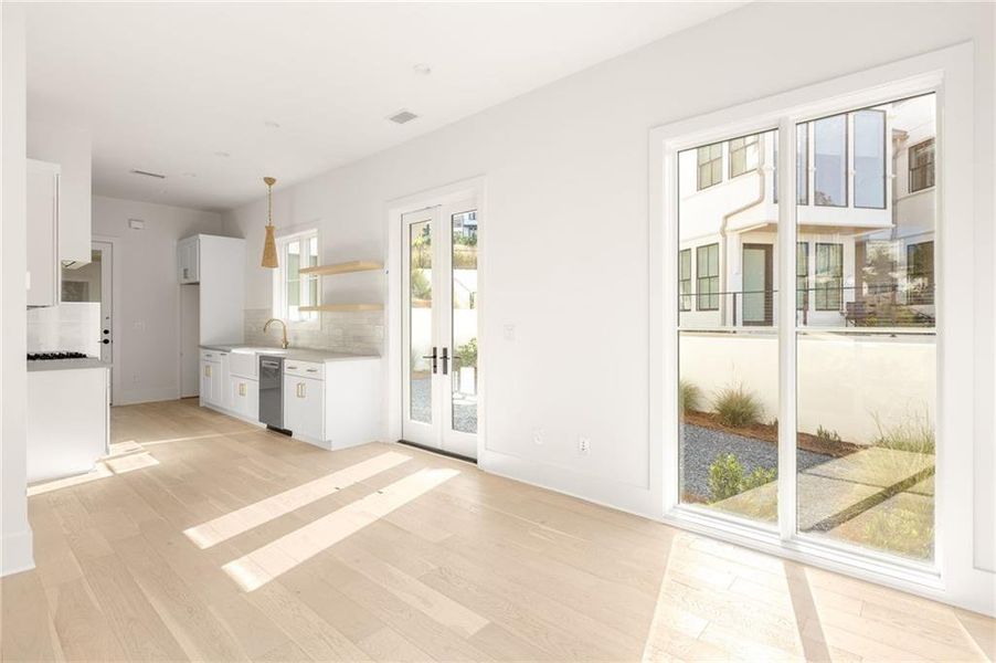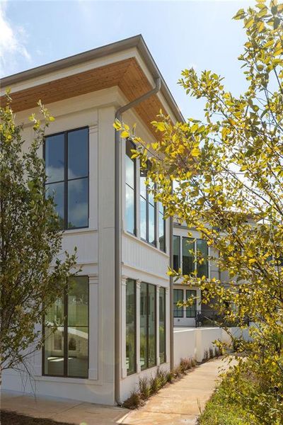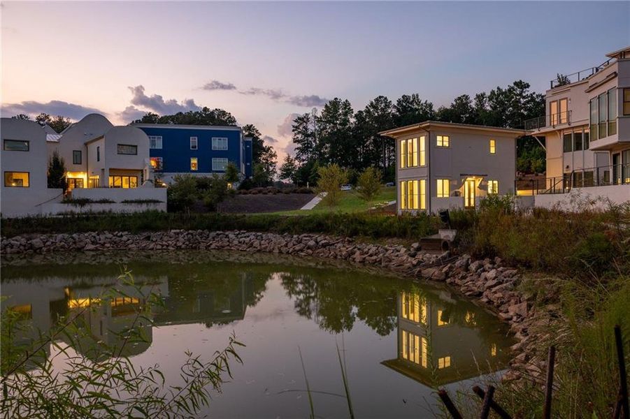 This adorable jewel box cottage on Mado Pond offers thoughtful design and peaceful waterfront living. The open floor plan blends living and dining spaces, highlighted by floor-to-ceiling windows that frame year-round pond views and Rachel Garceau's striking Mado Pond art installation. A spacious courtyard extends off the living room, ideal for al fresco entertaining. Upstairs, the primary suite includes a full bathroom and generous walk-in closet. Perfectly located next to the Mado Amphitheater, you can enjoy seasonal events like quiet evening music in the summertime and intimate community gatherings just right outside your front door. All of this within a short distance of Serenbe’s wellness amenities and 20+ miles of protected forest nature trails.