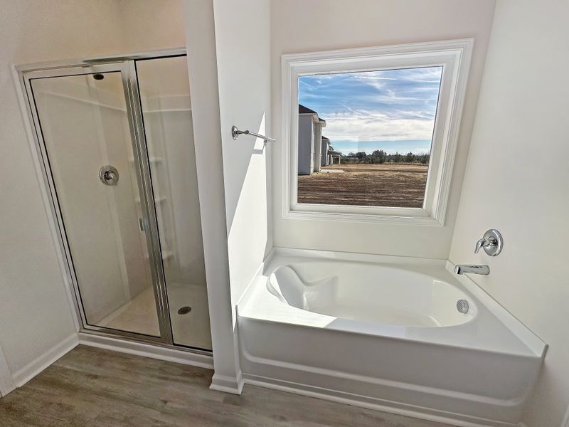 Step inside our Trask plan, a spacious ranch style home offering 4 bedrooms and 2 bathrooms on a single level. The open layout features a large family room with views of the covered back patio. The kitchen is designed for entertaining with a generous island and seamless flow to the living areas. Two bedrooms near the foyer share a full bath, while the fourth bedroom is located between the laundry room and garage entry, making it a great guest space. The private primary suite sits at the rear of the home and includes a large walk in closet and en suite with dual sinks, soaking tub, and separate shower. This plan combines comfort and functionality for everyday living. Artistic renderings are for informational purposes only and actual features may vary.