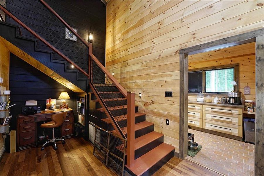 Interior highlights include stylish designer accents throughout the home. This bright and fresh 2-story open-concept great room boasts a beamed cathedral ceiling lined with Blue & Buggy Pine wood that creates a warm backdrop for the striking 10-foot contemporary ceiling fan. The cozy factor really kicks in with rich hickory wood floors, knotty pine wall accents, and a masonry-inspired stone veneer fireplace.
