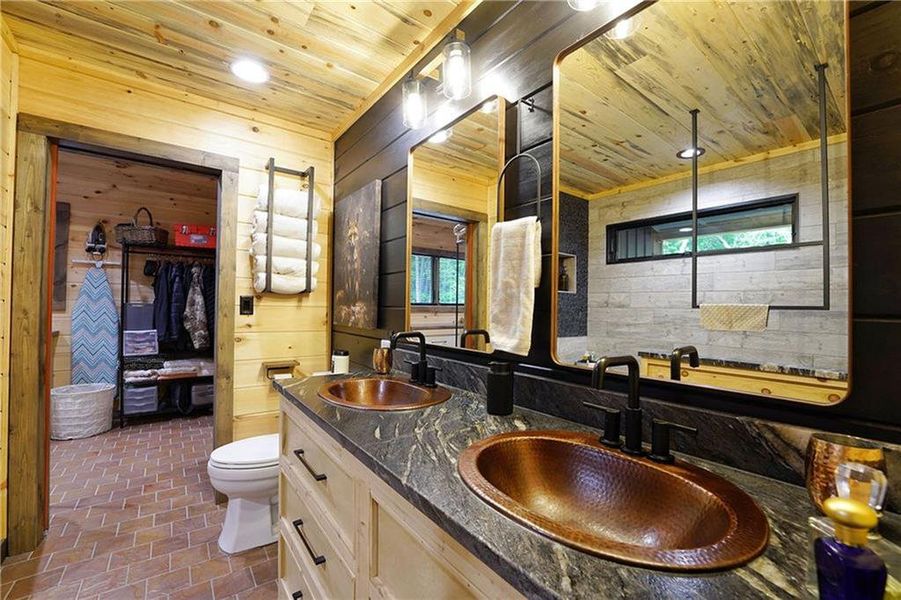The main-level primary suite offers its own in-wall fireplace, a double vanity with copper sinks and leathered granite, a walk-in shower with ceramic tile, and a vaulted custom closet with built-ins and pass-through to the laundry. Upstairs, a loft bedroom includes a full bath and travel closet.