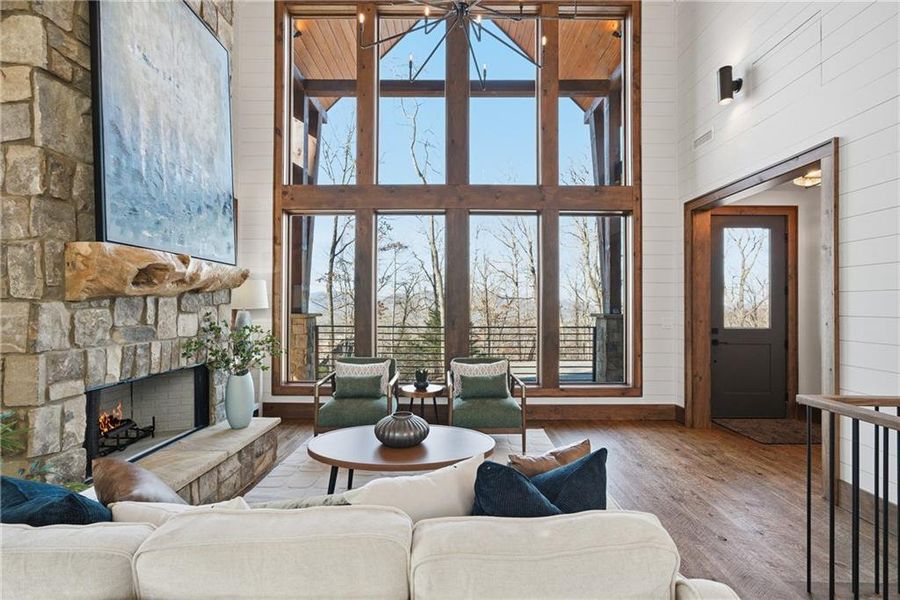 Imagine the pure joy and ultimate peace of mind of stepping into a brand-new home, where every detail is pristine and worry-free! This stunning new construction offers just that, blending rustic charm with modern luxury and efficiency. From the moment you arrive, you'll be captivated by the long-range mountain views that greet you from the expansive wraparound deck, perfect for enjoying your morning coffee or evening sunsets. Step inside to a vaulted, open-concept main living area, where exposed beams and a warm wood ceiling create an inviting atmosphere. A magnificent two-story stone fireplace with a wood log mantle serves as the heart of the home, complemented by a dramatic two-story wall of windows that floods the space with natural light and frames those incredible views. The gourmet kitchen is a chef's dream, boasting quartz countertops, sleek stainless steel Bosch appliances, including a 6-burner gas stove, an island with a convenient breakfast bar, and even more natural light pouring in from a wall of windows above the cabinetry. Enjoy easy access to the deck directly from the kitchen, making outdoor entertaining a breeze. The main floor features a luxurious primary suite, offering a private sanctuary. The primary bath is a spa-like escape with a dual sink vanity, gorgeous marble tile, and a spacious step-in shower with comfortable seating. For added convenience, a main-floor laundry area is cleverly tucked into the half bath. The fully finished basement expands your living space and features stylish stained concrete floors, a bonus room, two bedrooms with a Jack & Jill bath, and a spacious utility room for added storage. You'll also enjoy the efficiency and comfort provided by a modern heat pump and an on-demand tankless water heater, ensuring low utility bills and endless hot water. Short-term rental friendly, this home is more than just a place to live; it's a fresh start, meticulously designed for comfort, beauty, and years of worry-free enjoyment that includes a home warranty.