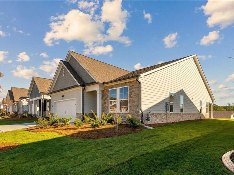 Welcome to The Glenwood A in the sought-after Kelly Preserve active adult community. This stunning 3-bedroom, 2.5-bathroom home spans 2,200 sqft, offering a harmonious blend of style and function. The gourmet kitchen is a chef's dream with quartz countertops, a pot filler, and sleek white cabinets accented by black hardware. Enjoy cozy evenings in the spacious living room by the linear fireplace, or step out to the covered patio on this generous lot. The primary bedroom is a serene retreat, highlighted by ample natural light and an oversized closet. The secondary bedrooms ensure everyone has their own space. High-end EVP floors add a touch of elegance throughout the home. Nestled in a gated enclave, Kelly Preserve offers resort-style amenities including a pool, clubhouse, and fire pit, set against a backdrop of a nature reserve. This vibrant community is conveniently located near Piedmont Eastside Medical Center with professional lawn care included.