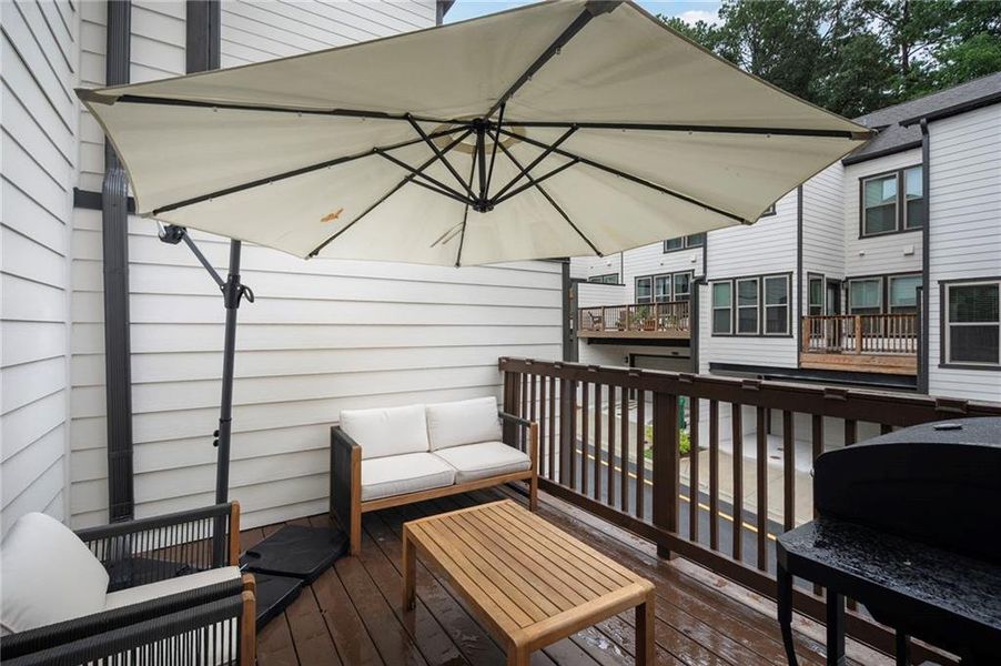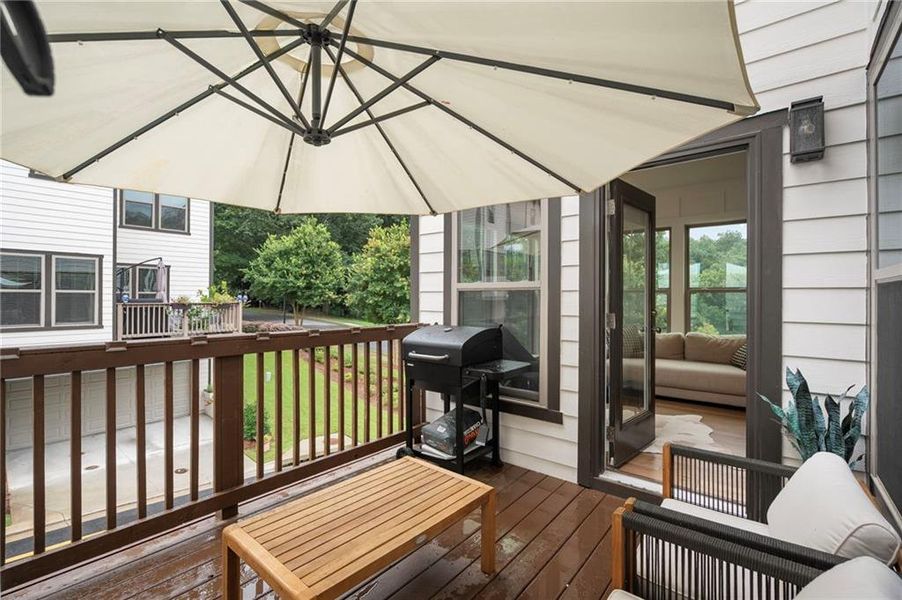 Just off the main living area, the sunroom offers panoramic views of the park’s treetops — the perfect setting for morning coffee or quiet reading. Step onto the deck to enjoy al fresco dinners or a glass of wine at sunset.